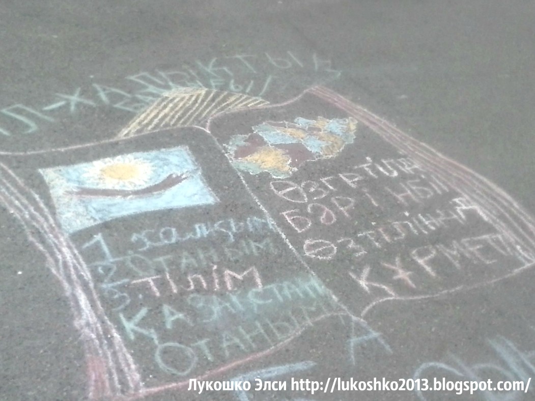 Это одна из работ, но увы, не занявшая призового места. А третье место не получилось сфотать, фотик подвел( Но опишу в словах - были нарисованы три флага - Казахстана, России и Америки в рисунках, условно повторяющих контуры стран.